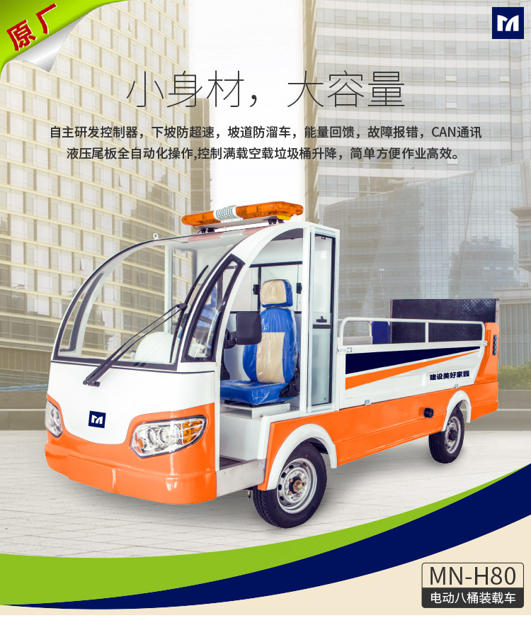 MN-H80电动八桶装载车适用于小范围、零散式垃圾桶的收集和运输,可装载8只240L标准垃圾桶